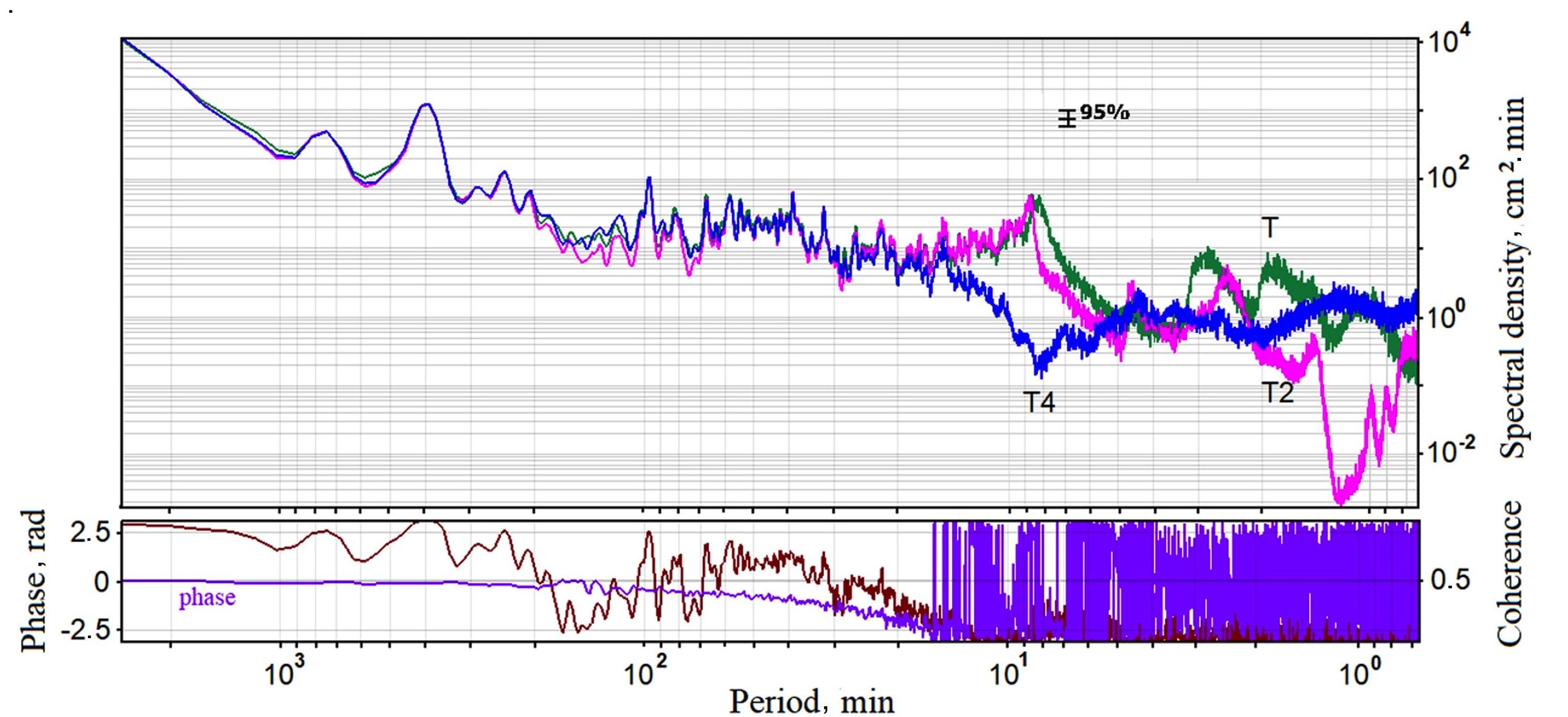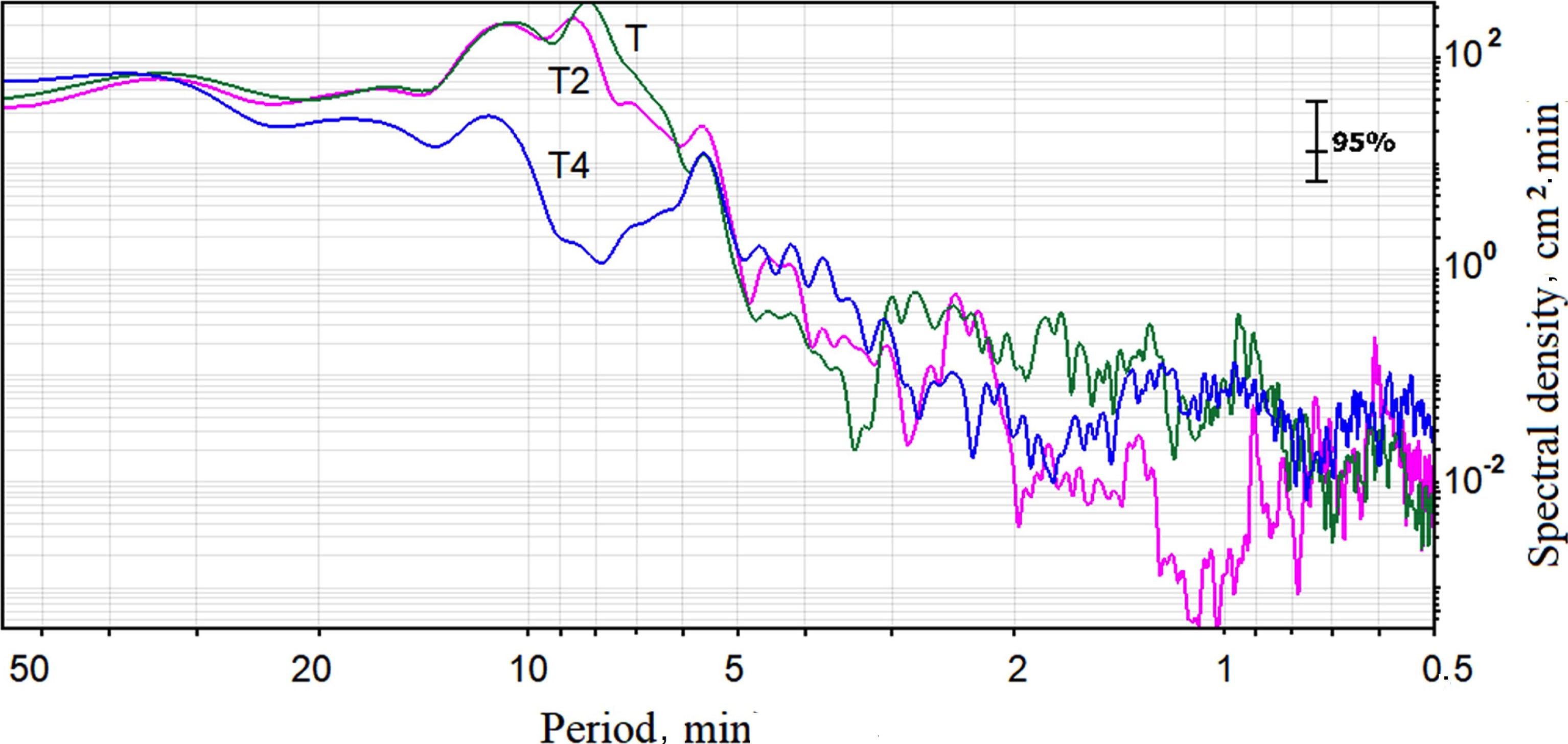 For the segments of time series under consideration (Fig. 5), the spectral densities of sea level oscillations (shown in Fig. 7) are calculated. These more detailed graphs indicate the presence of peaks at 5.62 min period for all meters, as well as at 8.17 and 10.5 min periods for T meter, at 8.65 and 10.92 min periods for T2 meter and 11.37 min period for T4 meter. For periods of ~ 8 minutes, a significant minimum is observed in the spectral density of sea level oscillations, calculated from the T4 meter data.