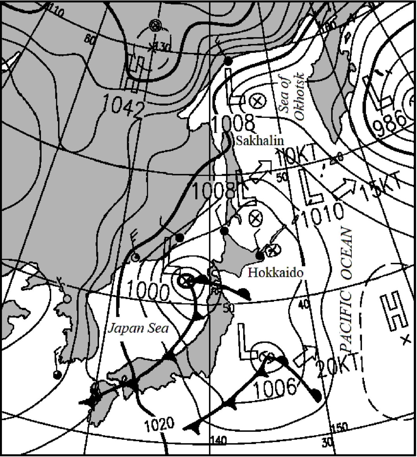 We are to consider the conditions for generation of such oscillations. They can be different [14], but are usually associated with atmospheric disturbances. Figure 6 shows a fragment of a synoptic map from the weather site rp5.ru for 20 January 2023 at 06:00. It can be seen that at the time of formation of large-amplitude seiches in the bays, a cyclone moved over Sakhalin Island southernmost tip and it was accompanied by prolonged north-northeast winds of 7–19 m×s–1 speeds and gusts of up to 15 m×s–1. It is obvious that the generation of seiches is caused by the impact of this cyclone. By the time of seiche generation, the background wave did not exceed 5 cm for the waves with periods of up to 10 min. Storm waves arrived at the observation points 12 hours after the occurrence of maximum-amplitude seiches and reached their maximum of 70 cm after 21 hours.