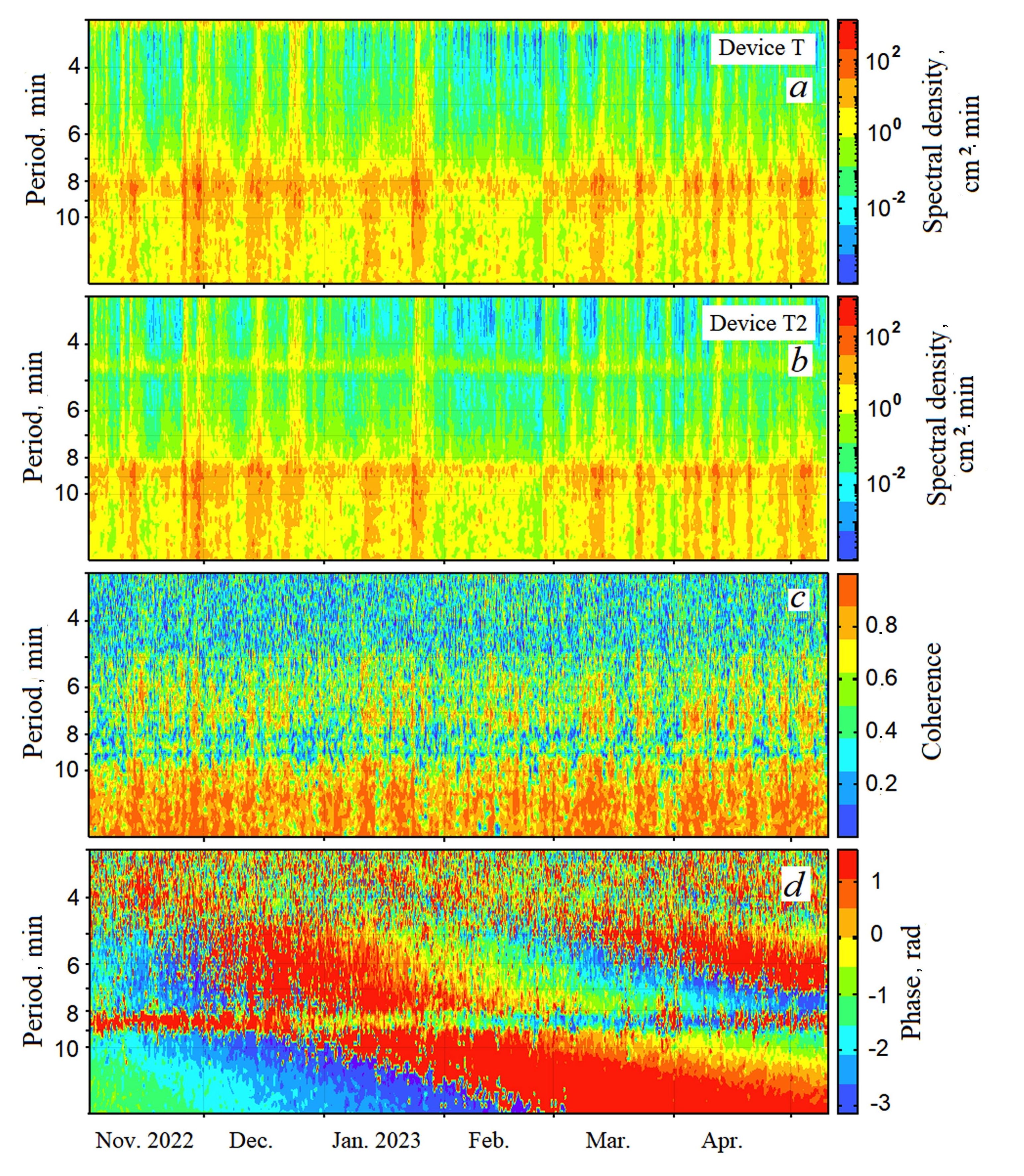Interaction of oscillations in neighboring bays is clearly demonstrated by the spectrogram of their phase difference (Fig. 9, d). There is (at 8–9 min periods) a stable horizontal band for the entire observation period, corresponding to the range of periods of eigen oscillations of the bays. Moreover, in January 2023 the oscillations were close to in-phase, and in March – April 2023 – to anti-phase. Besides, a rather slow cyclic phase change is observed in this band. We found this effect and then described it in [1]; it is explained by the synchronization of oscillations in the bay by waves arriving to the inlet 4.