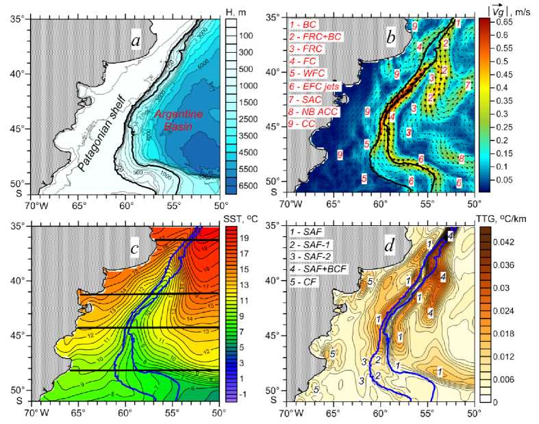 F i g. 1. Scheme of the bottom relief in the study area (a), spatial distribution of the mean long-term values of velocity module and the geostrophic current vectors (b), temperature (SST) (c) and total temperature gradient (TTG) (d) on the sea surface. Bold lines indicate locations of the 200 m and 1400 m isobaths. Horizontal lines show the parallels for which the climatic mean annual and monthly distributions of ZTG and the meridional velocity component Vg are presented. Abbreviation decoding: BC – Brazil Current, FC – Falkland Current, FRC – Falkland Return Current, WFC – West Falkland Current, EFC – East Falkland Current, SAC – South Atlantic Current, NB ACC – Northern Branch of the Antarctic Circumpolar Current, CC – coastal currents, SAF – Subantarctic Front, BCF – Brazil Current Front, CF – coastal fronts