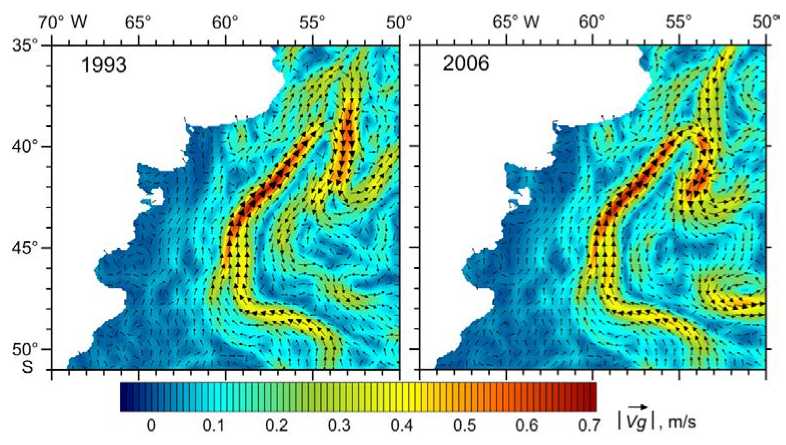 Main circulation features revealed in the mean long-term field of geostrophic velocity are clearly seen in the distributions of current vectors and velocity module for each year (Fig. 3). Despite the interannual variability of flow intensity, the position of the main WFC, EFC, FC jets, the FRC+BC flow and two FC recirculations (in the region of 40°S and between 35° and 36°S) controlled by the bottom topography features is maintained throughout each year.
