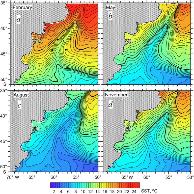 North of 45°S, the SAF structure exhibits one branch throughout the year which is the western boundary of the tongue of cold waters transported by the FC separating them from the warmer shelf waters (Figs. 5, b – d). Here, the maximum SAF intensification occurs in February – March (Figs. 6, b, c; 7, a) when the maximum warming of surface waters is observed. During this period, the 9–12 °C isotherms in the tongue of cold waters do not practically change their latitudinal position and are maximally shifted to the south (Figs. 8, a, c). The intensification of temperature contrasts supporting the front is due to more intense warming of the shelf waters where the SST values increase in the northerly direction from 16 °C to 21°C during this period, while they change from 12 °C to 17 °C to the east of the front in the tongue of cold waters (Fig. 4, a).