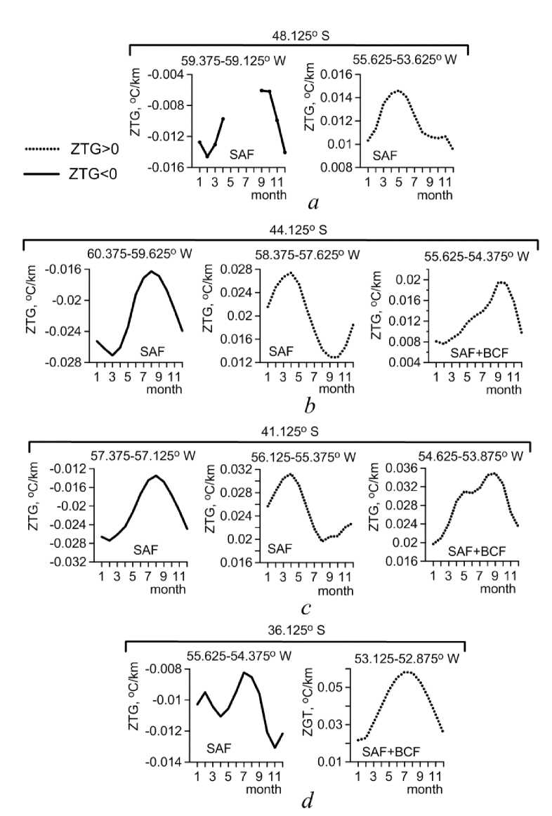 To the south of 48°S, above the northern boundary of the Falkland Plateau, the main extremum of the ZTG in the SAF structure observed throughout the year (Fig. 5, a) is maximally intensified in May (Figs. 6, a; 7, b) during the period of intense cooling of surface waters.