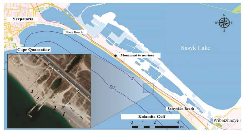 F i g. 1. Schematic map of the Kalamitsky Bay northern part. Inset shows a satellite image of seawater intake on the Lake Sasyk bay-bar, numerals denote section locations and numbers