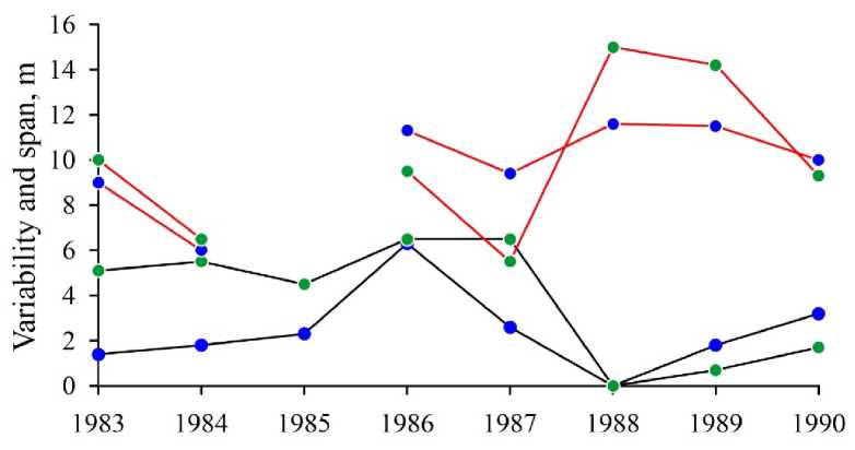F i g. 2. Interannual variability of the coastline position (black curves) and the range of its seasonal fluctuations (red curves). Blue points show the western part of the Lake Sasyk bay-bar, green ones – its eastern part