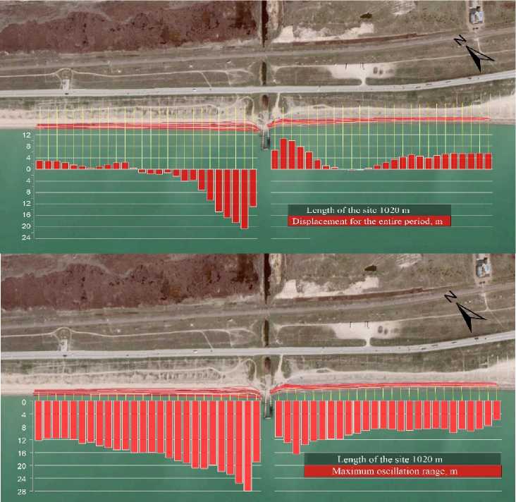 F i g. 5. Resultant (top) and maximum (bottom) coastline displacements in 2006–2022 based on satellite images