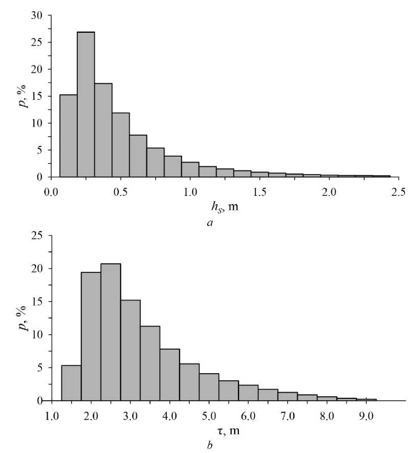 We are to consider some statistical characteristics of waves obtained from the calculated series. Fig. 7 demonstrates repeatability of significant wave heights and mean wave periods. As can be seen, waves of 0.25 m height have the maximum repeatability. As the wave height increases, its repeatability decreases monotonically. Values do not exceed 0.5 m in 71% of all cases. At ≥ 1, the waves have a repeatability of 12%, at ≥ 2.0 m – less than 1.5%. The highest repeatability of mean wave periods falls on the interval of 2.0–2.5 s which includes 56% of all cases.