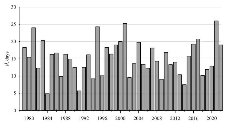 Fig. 11 represents the distribution of total duration d of storm situations by year. As can be seen, it varies within 4.9–26.0 days. The mean d value is 15.1 days. A long total duration of storms (d > 20 days) is observed in 1981, 1983, 1995, 2001, 2017 and 2021. The storms of 2001 and 2021 have the longest total duration.