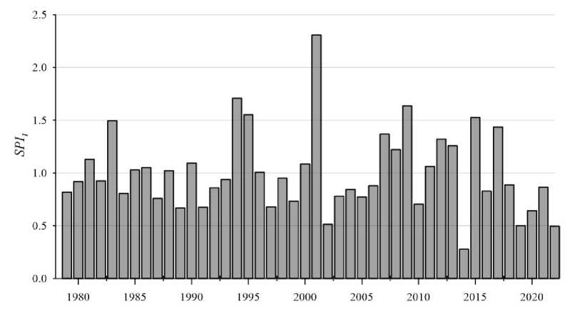 Fig. 12 shows the distribution of total dimensionless storm power index SPI1 = SPI/SPI0 by year, where SPI0 = 0.573·106 m2·h is the mean SPI value. 5 years (1994, 1995, 2001, 2009 and 2015) with increased storm activity (SPI1 > 1.5) stand out in the graph. It is noteworthy that this list does not include 2021, which has the maximum total duration of storms (Fig. 11).