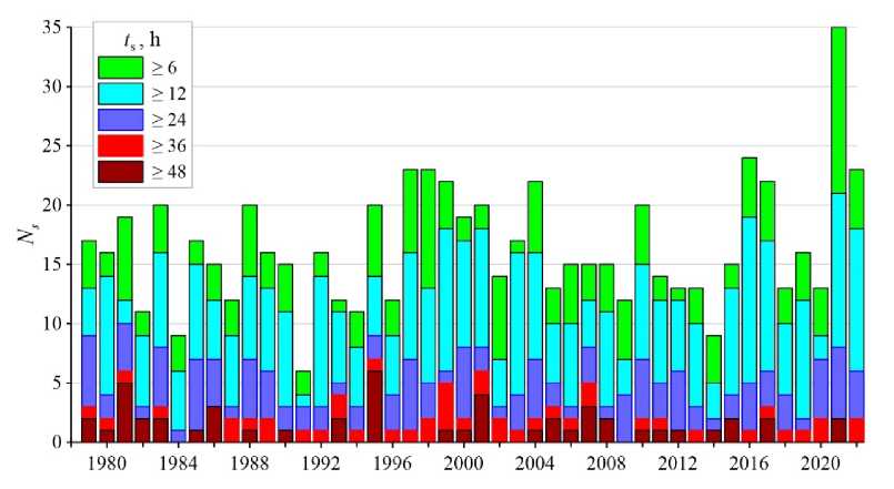 Figure 13 shows the distribution of Ns values by years for five storm duration gradations given in Table 2. The histograms shown there detail the information from Fig. 11. For all years except 2021, Ns value for ≥ 6 h is less than 25. According to ≥ 6 h gradation, 2021 has the largest storm number (Ns = 35). However, this year is inferior to other years in terms of the number of the longest (strongest) storms. For ≥ 48 h gradation, the number of storms in descending order is as follows: Ns = 6 for 1995; Ns = 5 for 1981; Ns = 4 for 2001; Ns = 3 for 1986 and 2007. Next comes a group of eight years with Ns = 2 which includes 2021. Another 12 years have Ns = 1. Mean long-term values of storm number by gradations of duration are as follows: 16 storms for ≥ 6 h; 12 storms for ≥ 12 h; 5 storms for ≥ 24 h; two storms for ≥ 36 h; one storm for ≥ 48 h.
