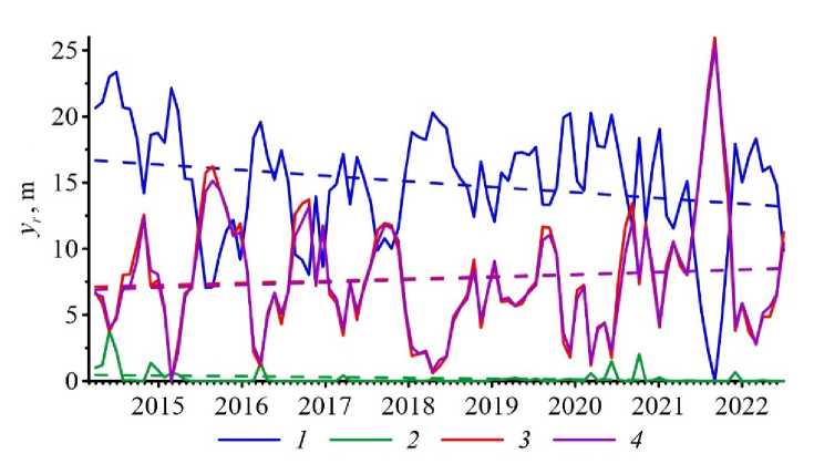 For each section 1–4, the minimum values of calculated increments ∆yimin were found and graphs of calculated relative increments yri(x) = ∆yi – ∆yimin were constructed for the simulated time period of March 12, 2014 – July 23, 2022 (Fig. 15). The trends (dashed lines of the same color) corresponding to relative increments for each section are also given in the figure.