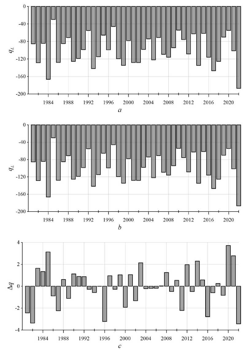 Mean annual values of sediment rates on the left () and right () computational domain boundaries, as well as their difference , presented in dimensionless form are given in Fig. 16 for the period 1979–2022. They were calculated using formulas