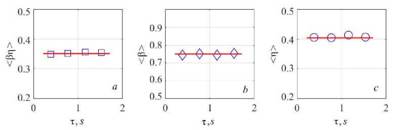 In Fig. 3, b, diamonds show estimates of β calculated using formula (3) for distributions in considered intervals τ. Values β have a small spread and cluster around a mean of 0.75 (solid line). The behavior of in different βη intervals requires separate consideration.