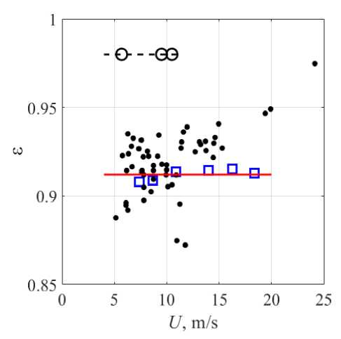 In Fig. 4, squares show the wind dependence of our calculated ε, the solid line shows the average value equal to 0.91; light circles correspond to the data of [1], dark circles – to the data of [14].