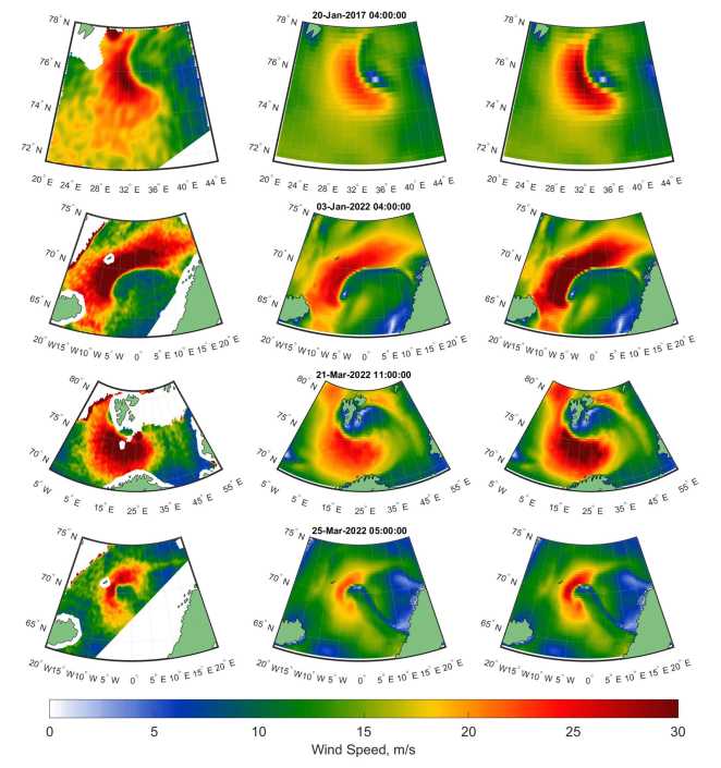 F i g. 1. Surface wind speed fields in considered ETCs. Left column: wind speeds estimated by the AMSR-2; middle column: the ERA5 wind speed estimations; right column: wind speeds adjusted using Eq. (4)