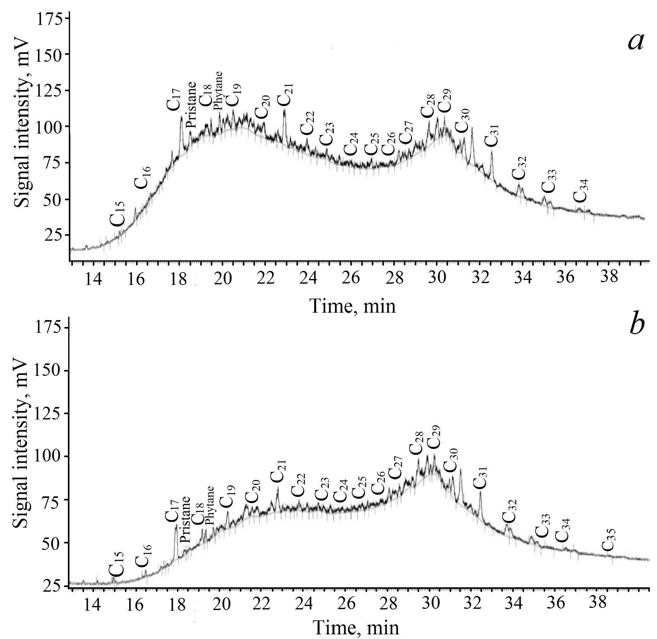 Fig. 4. Typical chromatograms of bottom sediments in Kamyshovaya Bay: a – station 38 (distribution due to a few sources); b – station 35a
