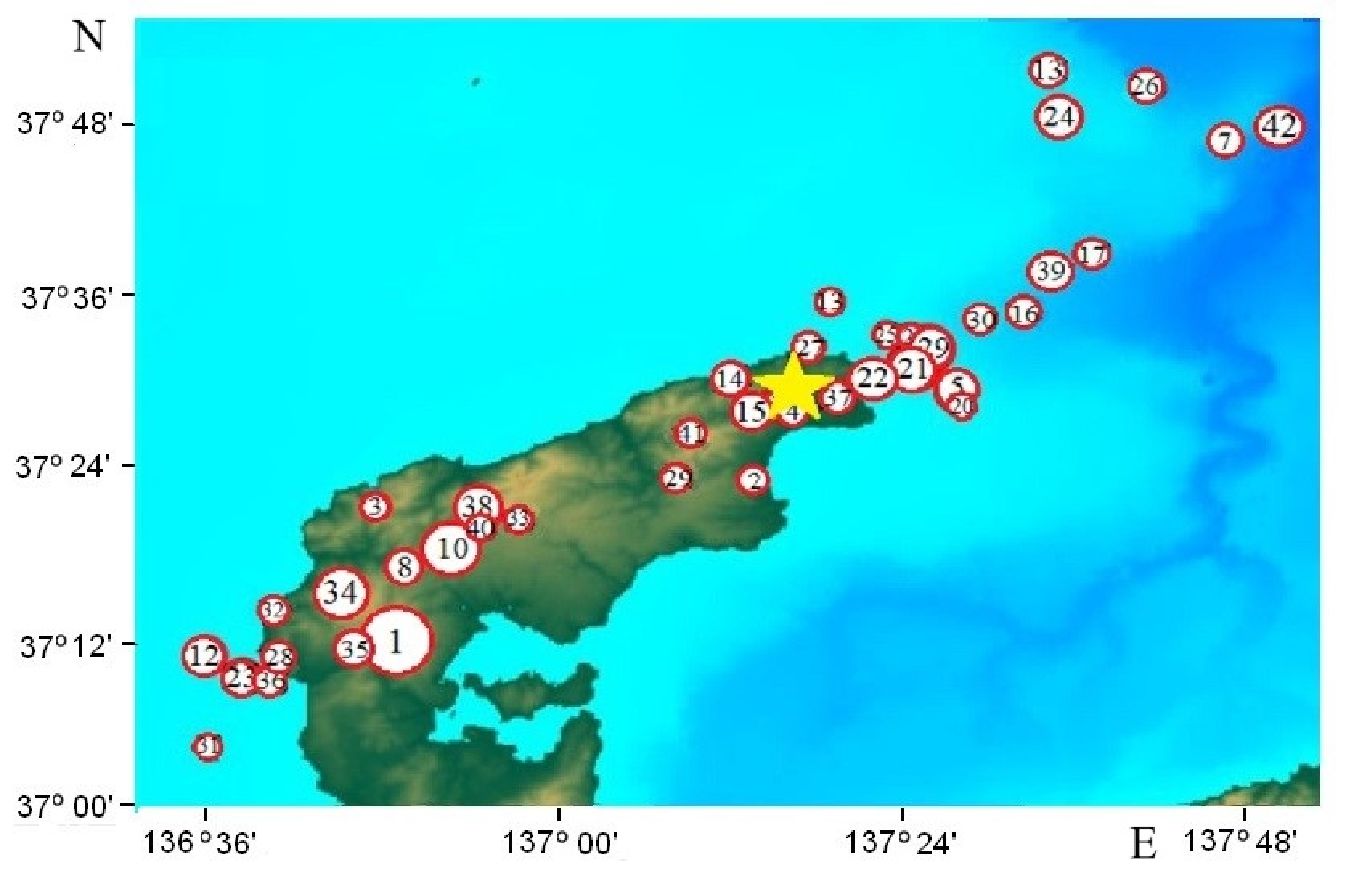 Fig. 2. Aftershocks after the 01.01.2024 earthquake on the Noto Peninsula (yellow star is the earthquake epicenter; circles with numerals indicate the order of aftershocks 5)