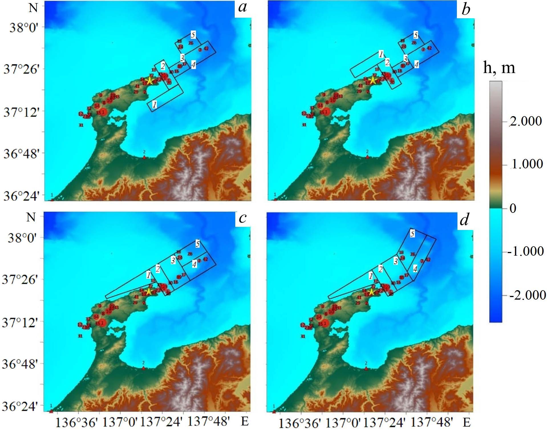 Four scenarios with different localizations of earthquake source (Fig. 4) were considered in this work. Figure 4, a shows scenario 1 with block 2 in the Toyama Bay area southeastwards of the Noto Peninsula. In Fig. 4, b, the same block is located in the Sea of Japan northwestwards of the Noto Peninsula. The location of the remaining blocks in the earthquake source is similar for these scenarios. Figure 4, c shows the source localization for scenario 3. It can be seen that the block located northwestwards of the peninsula took a triangular shape stretching along the entire peninsula. The shape of the remaining blocks also changed. In scenario 4, the shape of blocks 1–3 did not change, but direction of the location of blocks 4 and 5 changed. This change in the localization, size and orientation of the blocks is due to a comparison of simulation results with in situ data and the data from other authors. A total of 14 simulation options were carried out, with 4 of them being presented in this paper.