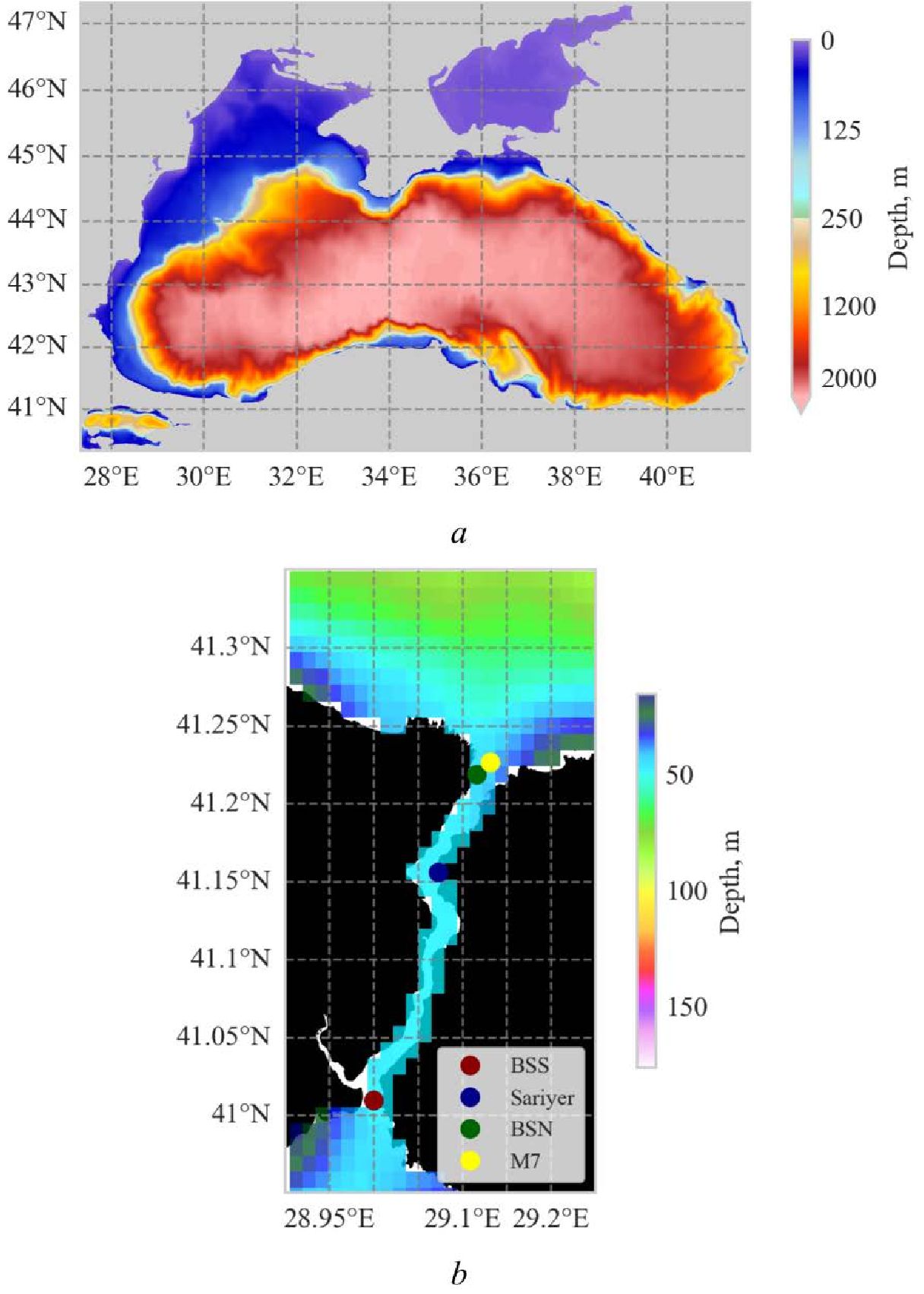 The paper uses the results obtained in the regional configuration of the interdisciplinary framework Nucleus for European Modeling of the Ocean (NEMO) [4] for modeling the components of the ocean (marine) system with high spatial resolution. It allows the simulation of meso- and submesoscale variability of hydrophysical fields in the seas of the Euxine Cascade. The computational domain is a quasi-regular grid covering the basins of the Marmara, Black and Azov Seas with steps of 1/96° × 1/69° in the meridional and zonal directions, respectively [5]. The resolution is approximately 1.157 km in the meridional direction. In the zonal direction, the step varies uniformly from 1100 m in the north to 1230 m in the south. The bottom topography is based on the EMODnet digital bathymetry array 1 (Fig. 1, a).
