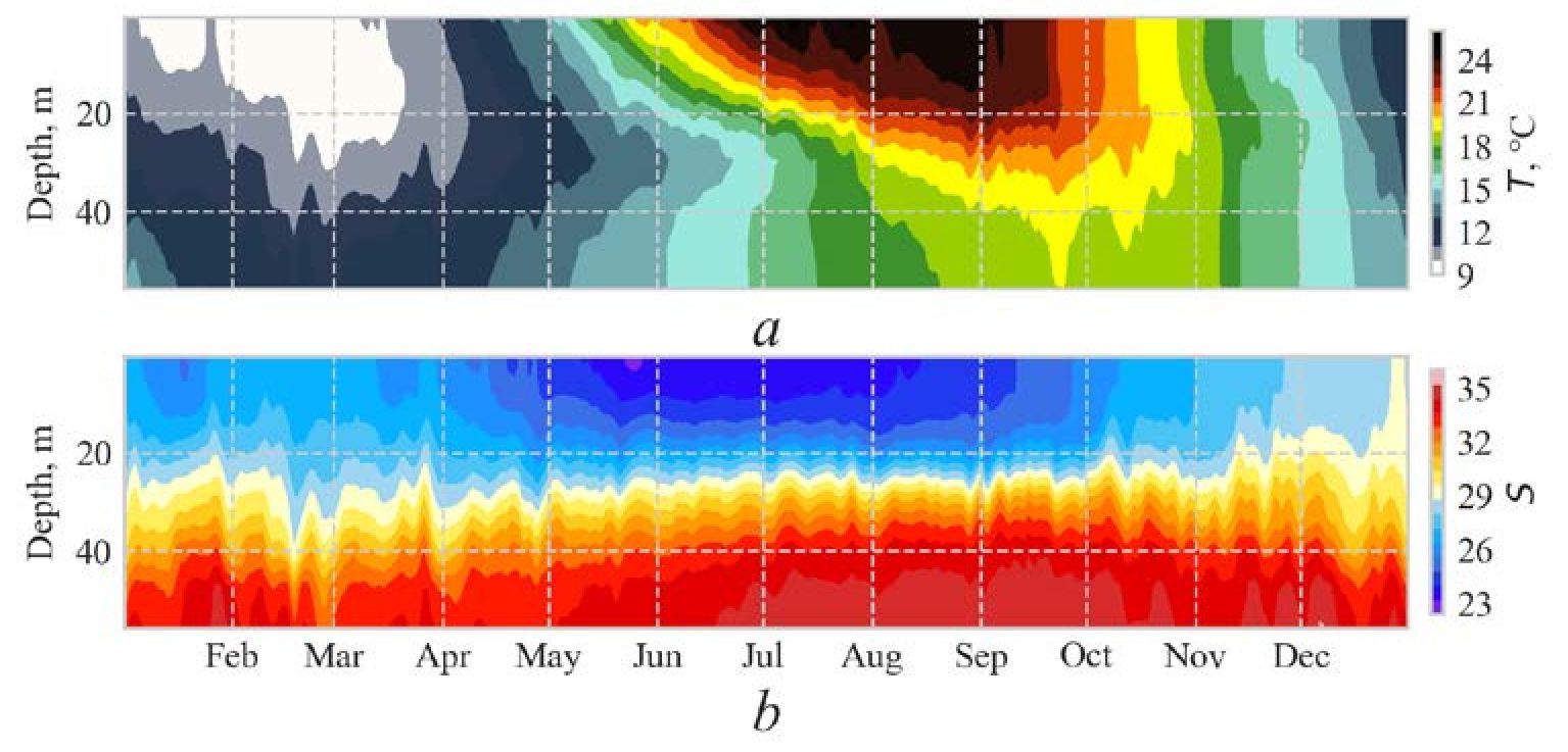 The salinity fields according to CMEMS data demonstrate a typical vertical haline structure of waters in the Marmara basin, where the salinity of the upper layer is determined by the inflow and subsequent transformation of less saline Black Sea water masses. Salinity increases significantly with depth due to the influx of Mediterranean waters, with a salinity difference of over 12 between the deep and surface waters (Fig. 2, b).