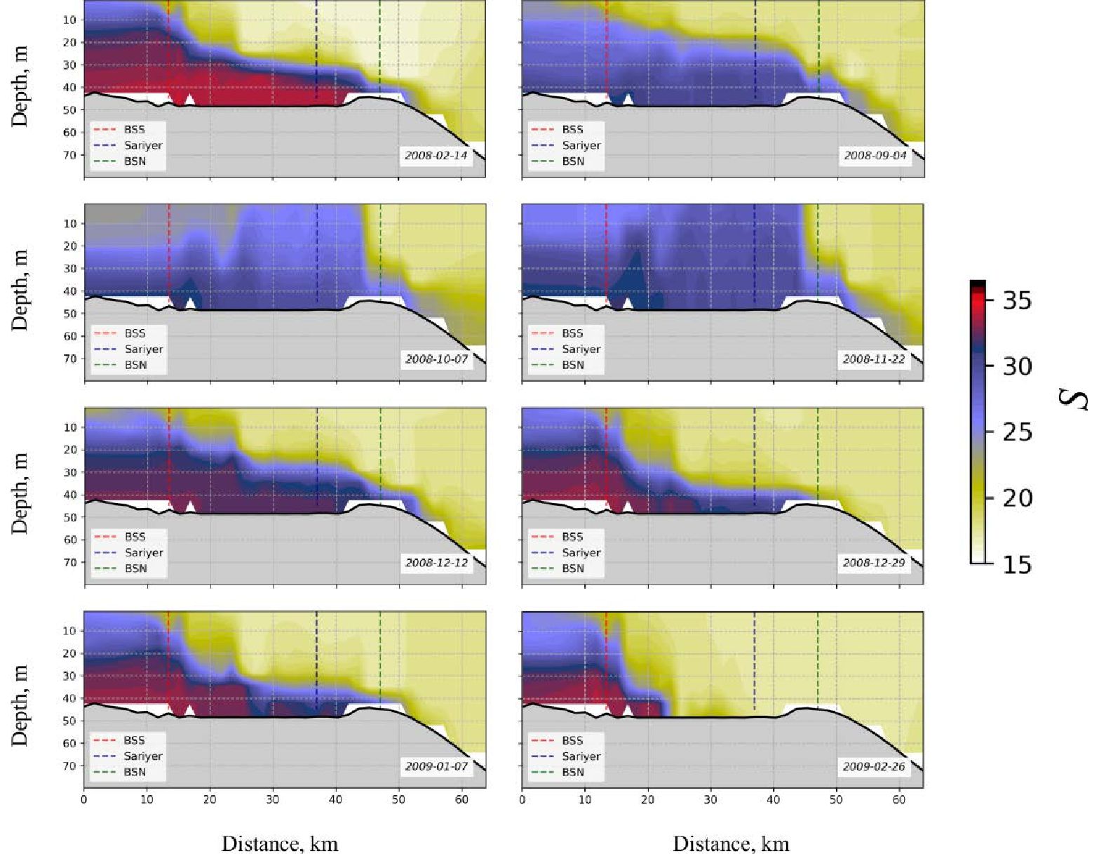 Furthermore, the salinity of the lower layer is also subject to seasonal variation in our calculations. During the winter months, the salinity can reach 30–35 (Fig. 3). In this instance, the salinity of the water reaches the threshold at the point of exit from the Bosphorus along the seabed. In general, the boundary between the layers expands and rises to the surface as the area approaches the Marmara Sea (Fig. 3). In certain periods, the salinity at the bottom reaches 25–30 (Fig. 3, fragment from 09 April 2008).