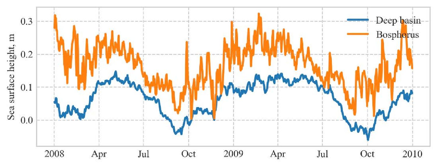 Furthermore, our calculations confirm the mechanism for maintaining the upper Bosphorus Current during the winter period, as previously established in work [2]. The elevation of the Black Sea level in the Bosphorus region is the determining factor. This is caused by the intensification of the Black Sea Rim Current at this time (Fig. 5).