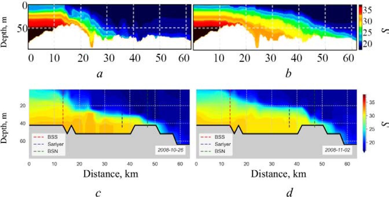 In comparison with the findings of the study [2], salinity profiles along the strait on 26 October and 2 November 2008 (Fig. 6) will be considered. In comparison to the results presented in work [2], our calculations indicate that the Marmara Sea waters extended to the north to a somewhat greater extent in October. Nevertheless, as in the aforementioned work, our calculation also reveals the obstruction of Black Sea waters at the boundary with the Marmara Sea. In both calculations, there is a tendency for the boundary to rise during the October–November period. The temperature of the bottom waters in our results was found to be lower (Fig. 7). The process of incorporating more saline, yet warmer Marmara Sea waters into the Black Sea basin is less discernible in terms of temperature.