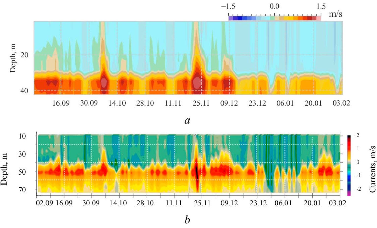 Furthermore, the currents within the strait exhibit a two-layer structure (Figs. 3 and 4, b). In the upper layer, the currents are directed from the Black Sea to the Marmara Sea. This layer is comprised of Black Sea waters, which undergo gradual transformation as they are transported along the strait. The current in the lower layer is oriented towards the Black Sea. The water in this layer is derived from the Marmara Sea and undergoes transformation as it is transported along the strait. However, an analysis of the meridional velocity over time reveals the occurrence of periods during which the upper Bosphorus or lower Bosphorus current is obstructed in the strait (Fig. 4, a, b).