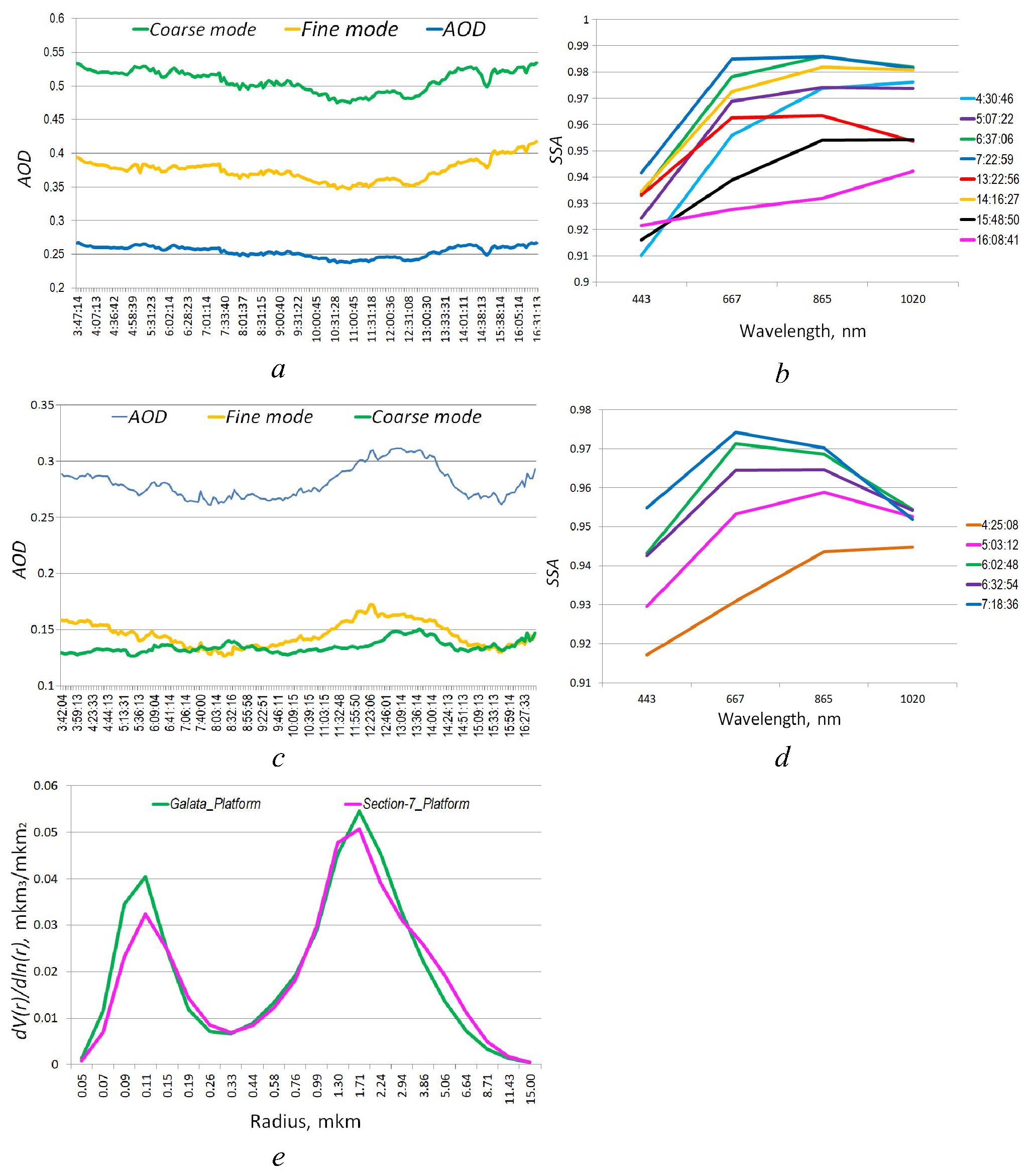Fig. 2. At the AERONET network stations on 28 July 2021: contribution of fine (less than 2.5 mkm) and coarse particles (2.5 mkm and more) to the overall distribution of AOD at Galata_Platform (a) and Section_7 (с), single scattering albedo at Galata_Platform (b) and Section_7 (d), particle size distribution at two stations (e)
