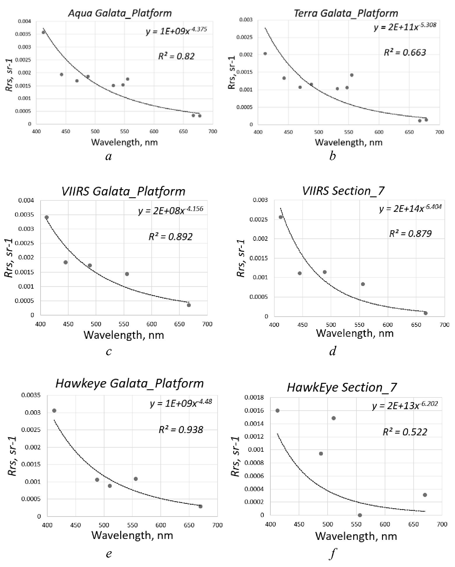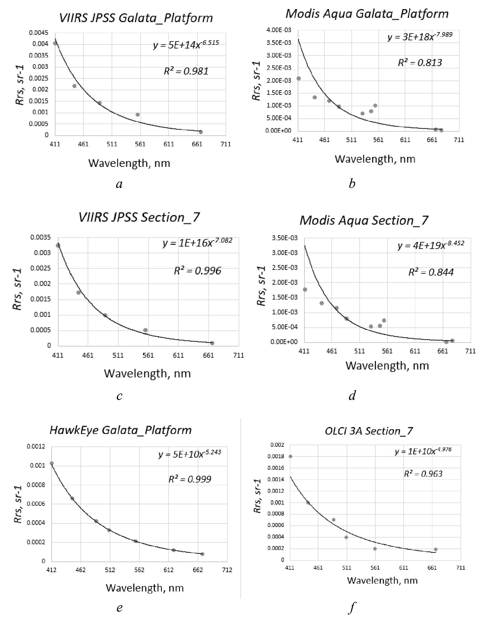 As a result of approximation of the atmospheric correction errors for 28 July 2021, power-law dependencies close to λ−5 were obtained. This is explained by the total contribution of: 1) the molecular component (λ−4) and 2) the aerosol absorption (λ−1). Fig. 4 shows that the atmospheric correction error of the sea remote sensing reflectance for the Galata_Platform station, obtained from VIIRS-JPSS and HawkEye measurements, is close to the power-law dependence λ−4 − λ−5, and for the Section_7 station it has a more pronounced power-law dependence, namely λ−7. A pronounced shape of the power-law function is observed on 29 July 2021, when the dust aerosol concentration increases and its aerosol absorption is already close to λ−2. It is worth noting that the largest atmospheric correction errors were found for 29 July 2021 according to MODIS-Aqua data, whose interpolation function is close to the form λ−8. We believe that this is due to underestimated Rrs measurements in the longwave region for this day and consequently large errors in the standard power law approximation – the logarithmic method followed by linear optimization. Using a nonlinear approximation, the power function was obtained in the form λ−4 − λ−5, which also indicates large errors in the shortwave region of the spectrum. The maximum errors in the blue region are observed in Fig. 4, a, c; 5, a, c.