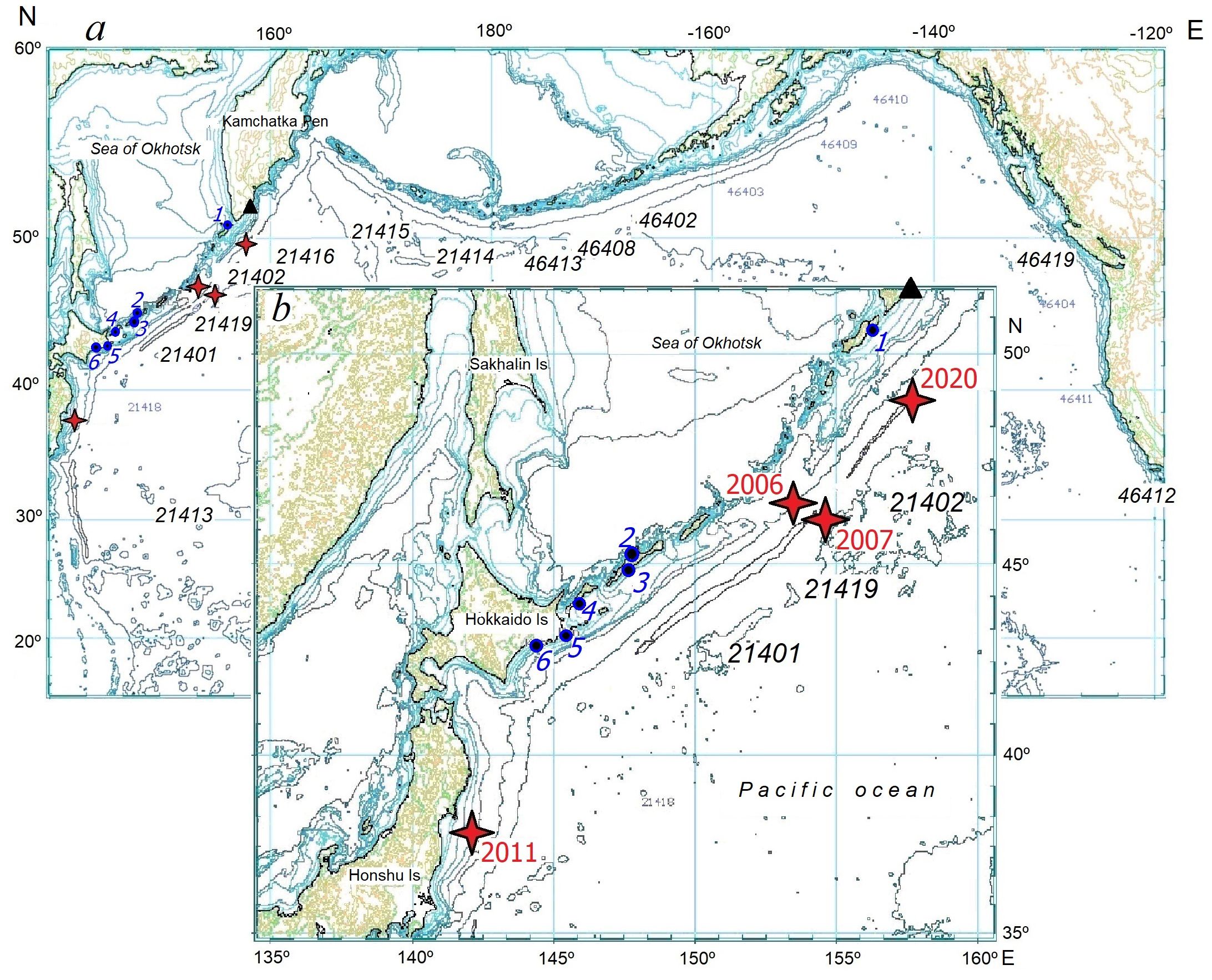 Fig. 1. Scheme of the computation areas: a – location of DART stations in the northern Pacific Ocean, the data from which are used for comparison with the calculated ones; b – the area near the Kuril Islands used in modeling the process of operational tsunami forecasting (black numbers indicate the location of DART stations; red stars – the earthquake epicenters with the year indicated; black triangle – the location of automated tide gauge “Vodopadnaya” (southeastern tip of Kamchatka); blue numbers – the settlements: 1 – Severo-Kurilsk (Paramushir Island), 2 – Kurilsk (Iturup Island), 3 – Burevestnik (Iturup Island), 4 – Yuzhno-Kurilsk (Kunashir Island), 5 – Hanasaki (Hokkaido Island) and 6 – Kushiro (Hokkaido Island))
