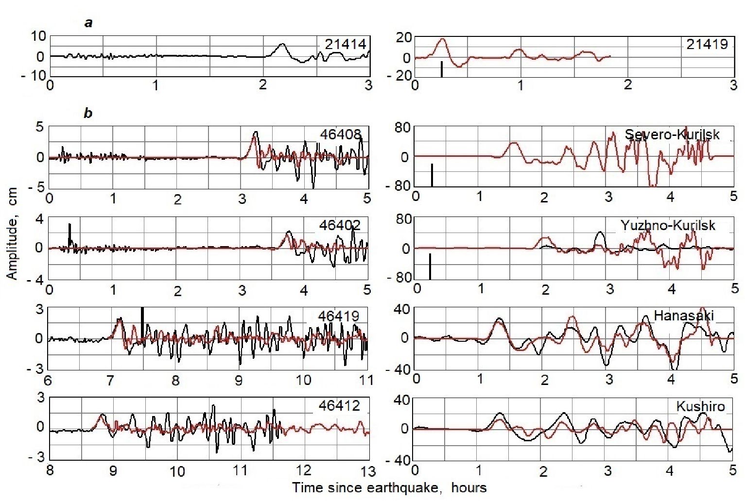 Fig. 3. Waveforms of the 2007 Simushir tsunami: a – recorded by the DART 21414 station (left) and reconstructed at DART 21419 station (right); b – recorded (black line) and computed (red line) based on the reconstructed data from DART 21419 station