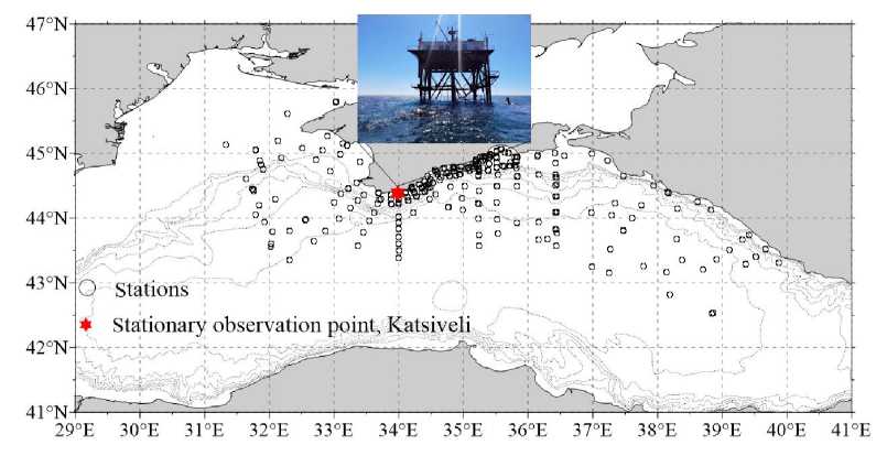 This study used the data from two different types of field measurements. Firstly, the data were obtained from shipboard measurements of pCO2 in the surface water layer, conducted on board the R/V Professor Vodyanitsky (cruises No. 81, 87, 89, 91, 94, 95, 98, 101, 102, 108, 114, 117, 119, 125, 126) between November 2015 and March 2023. These measurements covered all hydrological seasons, with the exception of the winter period (January, February). Secondly, the measurement data were obtained at a stationary point for the carbon dioxide flux observations located on the oceanographic platform of the Black Sea Hydrophysical Subsatellite Polygon (BSHSP, Katsiveli) from May 2012 to October 2022. Taking into account the fundamentally different conditions of measurements (including their frequencies on a spatio-temporal scale and the distance from the shore), the shipboard data and the data obtained at the platform were processed separately. The area under study and the scheme of sampling points are illustrated in Fig. 1.