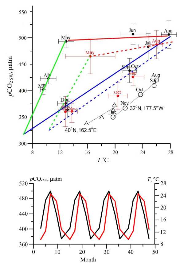 August | рСО2 sw = 0.44·T + 487.47 рСО2 sw = 8.85·T + 253.30 | рСО2 sw = 2.29·T + 427.42 рСО2 sw = 8.75·T + 237.76 |