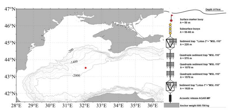 The data were obtained through the installation of sediment traps at five horizons in the deep part of the Black Sea (station installation depth 1968 m) along the transect of Cape Chersonesus – Bosphorus Strait (distance from Cape Chersonesus is 180 km).