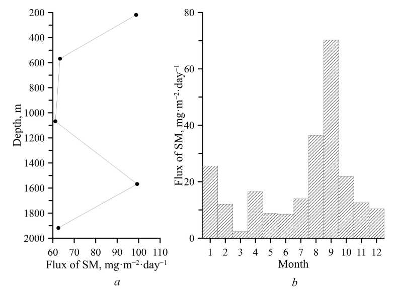 The seasonal variability of the SM flux at a depth of 218 m was characterized by a maximum in September (70.2 mg·m‒2·day‒1 over a 30-day period) and a minimum in March (2 mg·m‒2·day‒1) (Fig. 2, b). In general, the SM flux values exhibited a range of 9–36 mg·m‒2·day‒1, which corresponds to the data presented in [1, 16–18].