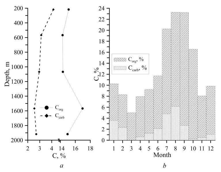 Fig.3. Distribution of organic (Corg) and inorganic (Ccarb) forms of carbon with depth (a) and during a year (b)