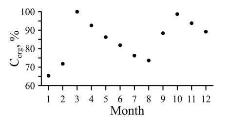 A comparable distribution of organic and inorganic forms of carbon revealed that the organic component is also characterized by pronounced seasonality, with maxima in March and October (Fig. 4). During the first period, a gradual decline in the Corg share was observed, reaching a reduction of 25% from March to August. In contrast, during the second period, a sharper decline in the Corg share was noted from October to January.