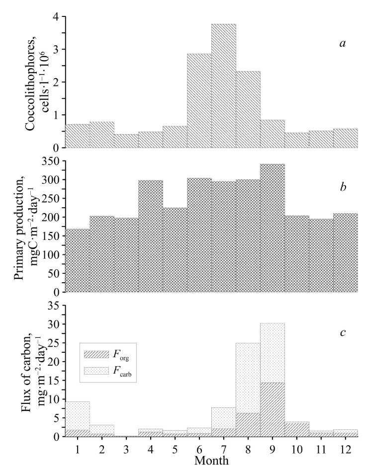 The observed lag of one to two months between the peak of phytoplankton productivity in the euphotic zone and the maximum values of inorganic carbon flux (represented mainly by coccolithophores) can also be attributed to sedimentation rates (within the 1–36 m·day‒1range) [24].