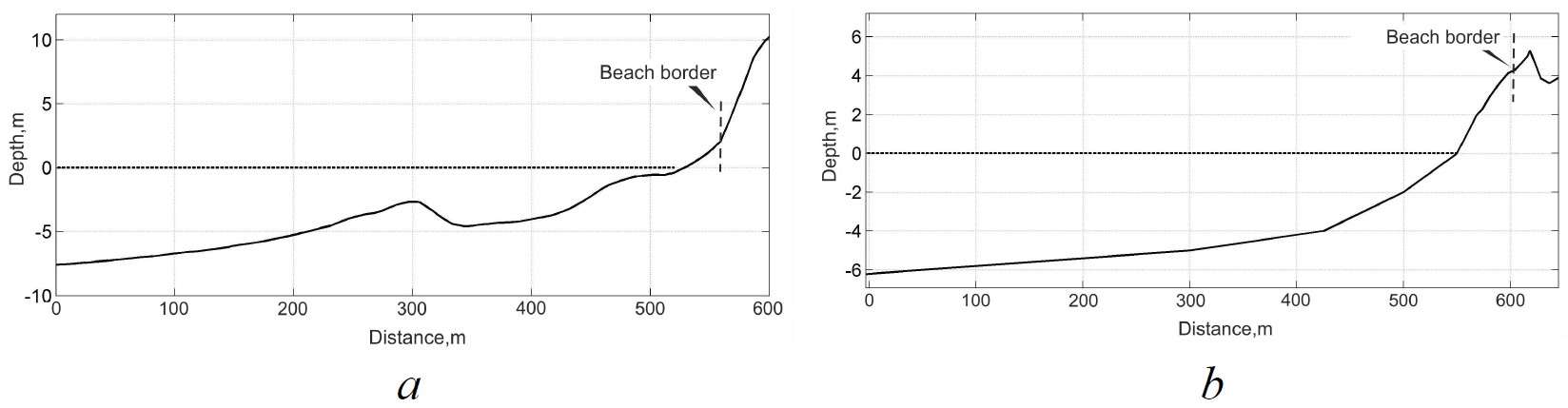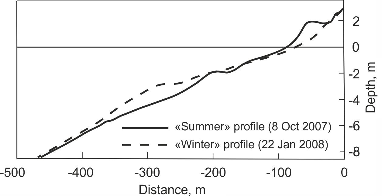 It should be noted that the wave conditions of the California coast, where the study of seasonal deformations of the sandy coast was conducted for the first time, are characterized by intense waves during the storm season and a relatively long period of influence by gentle Pacific swell waves during the moderate season. This phenomenon determines the corresponding differences in the coastal profile (see Fig. 1). In fetch-limited conditions, where short and steep wind waves predominate during the storm period and the swell effect is expressed insignificantly, the limiting states of the profile characteristic of different seasons may be less contrasting [8, 9].
