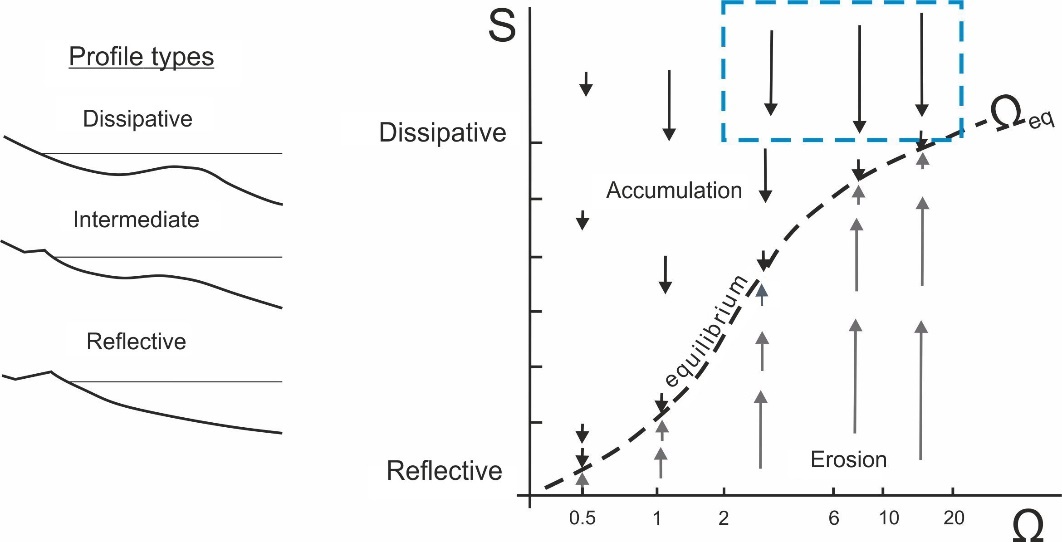 Fig. 2. Conceptual diagram illustrating the relationship between the type of coastal accumulative profile (indicative parameter S), the amount of wave energy (the Dean parameter Ω) and the relative intensity of accumulation and erosion (proportional to the arrow lengths). Blue dashed contour highlights the conditions of intense accumulation at higher wave energy on the dissipative profile (adapted from [12, р. 114])