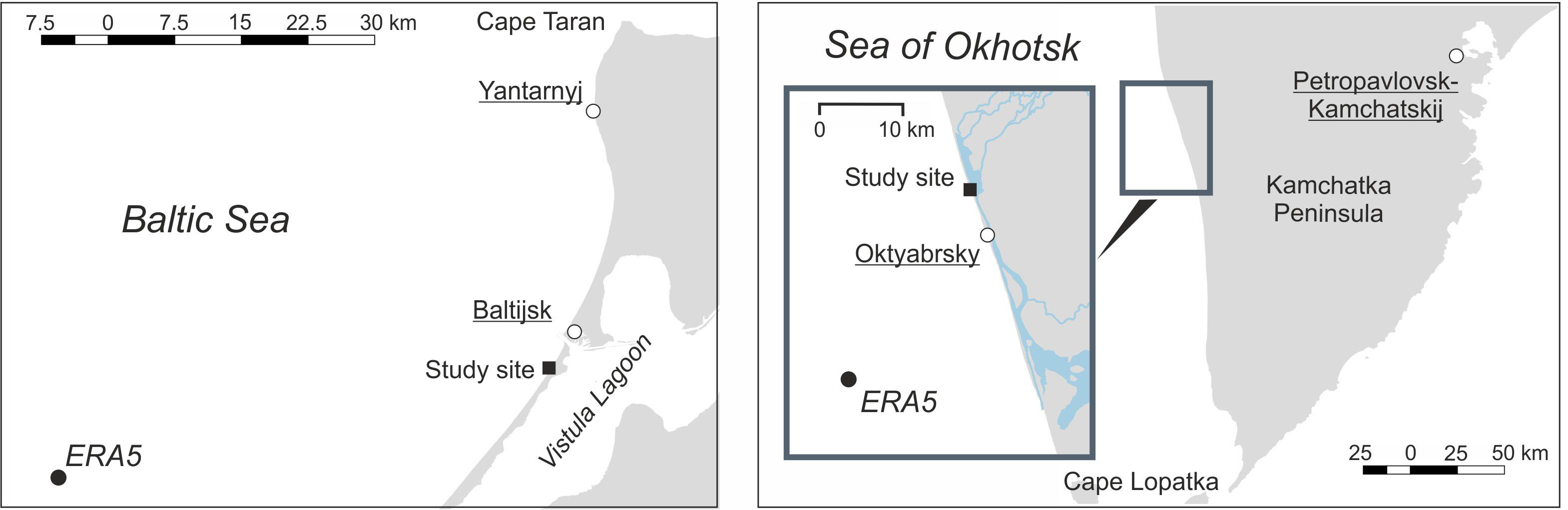 In order to achieve the set goal, two specific coastal regions were selected for study: the Vistula Spit area (South-Eastern Baltic) and the Oktyabrskaya Spit area (Oktyabrsky settlement, western Kamchatka, eastern part of the Sea of Okhotsk). These regions are associated with extended barrier forms of the coastal sand bar type.The differences between the selected regions are that the Western Kamchatka coast in the Oktyabrskaya Spit area is characterized by tides, with a maximum amplitude of 3 m [17]. A distinctive feature of this coast is the presence of ice on the beach from December to May, inclusive. In this regard, changes in relief, typical for a sandy coast and caused by waves, can only be observed from June to November. In contrast, the coasts of the South-Eastern Baltic are non-tidal, with ice in the coastal zone being extremely rare and limited to a period of no more than a few days.