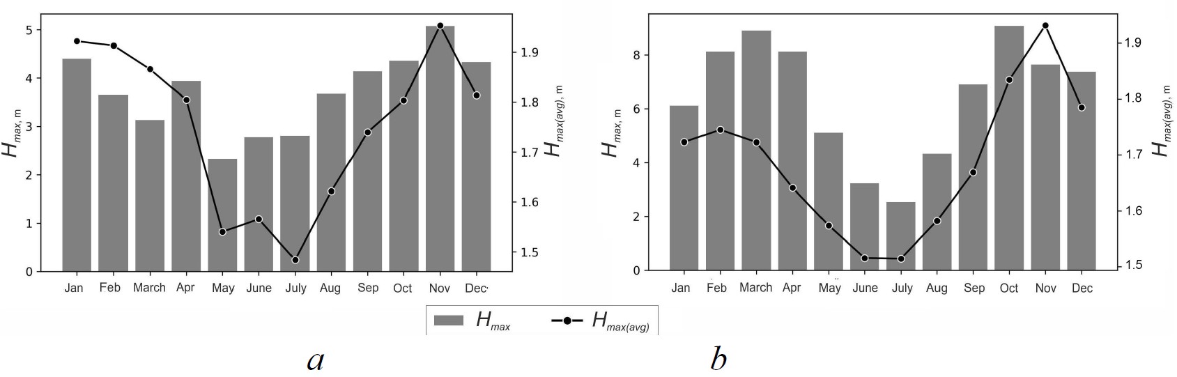 A study of two specific water areas revealed common features in the annual dynamics of storm activity. It was shown that maximum wave heights and their average values (Hmax, Hmax(avg)) exhibit well-defined seasonal variability, with a minimum in May – July, followed by an increase in wave intensity until November (Fig. 5).