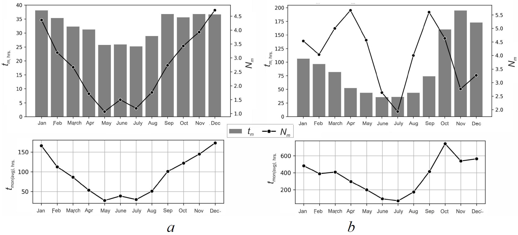 Fig. 6. Distribution of tm, Nm and tmon(avg) values by months: a – for the South-Eastern Baltic; b – for the Western Kamchatka