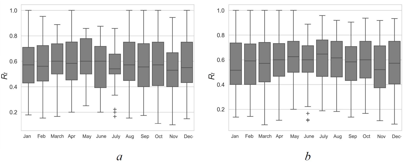 Fig. 7. Statistical characteristics of the change in index Rt during a year for the parts of water areas of the South-Eastern Baltic (a) and the Western Kamchatka (b) under study