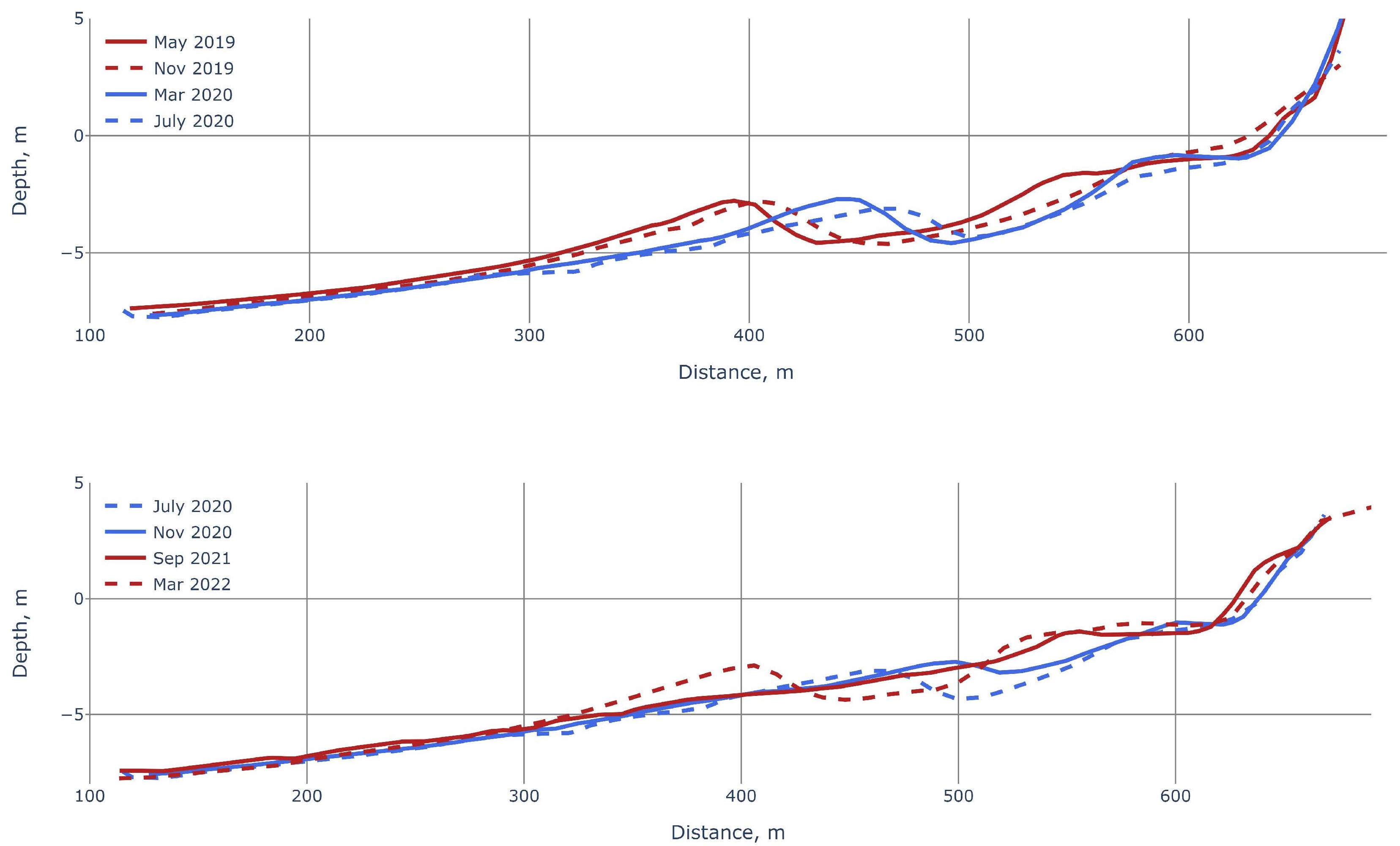 The results of the RH statistical analysis for the water areas under study by month were compared with the data on the sand profile morphodynamics in different seasons. Over the course of three years (from May 2019 to March 2022), relief measurements were taken on the Vistula Spit. They revealed that there are no coastal profile deformations in this section of the coast that can be characterized as seasonal. Throughout the observation period, a cycle involving the evolution of the underwater bar from a straightened outer one (May 2019) to a crescent-shaped one with subsequent adjoining to the coast (September 2021) (Fig. 9) was documented. In March 2022, a new outer underwater bar was formed. However, the typical seasonal morphodynamic rhythm, characterized by the coast’s retreat and the formation of an underwater bar during winter, followed by its subsequent adjoining to the coast in the form of an accumulative terrace during summer, remained unidentified.