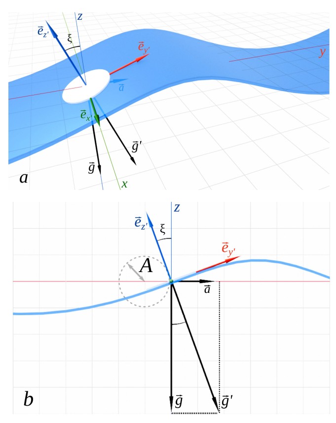 since the vector measured by the accelerometer is always normal to the surface. Indeed, the vector change of a stationary accelerometer reading, , is equal to the centrifugal acceleration of the sensor, , where is the wave phase, and are the unit vectors of the fixed reference frame. Obviously, the maximum tangent of the angle between the measured acceleration and the gravity vector is AΩ2 / g, which is exactly equal to the magnitude of the surface slope AK, if the deep-water linear dispersion relation, Ω2 = gk, is accepted. Thus, for linear waves, the acceleration measured in the moving reference frame is always directed along the z'-axis, and its variations are equal to the vertical acceleration of the fluid particles in the wave, as noted, for example, in [29].