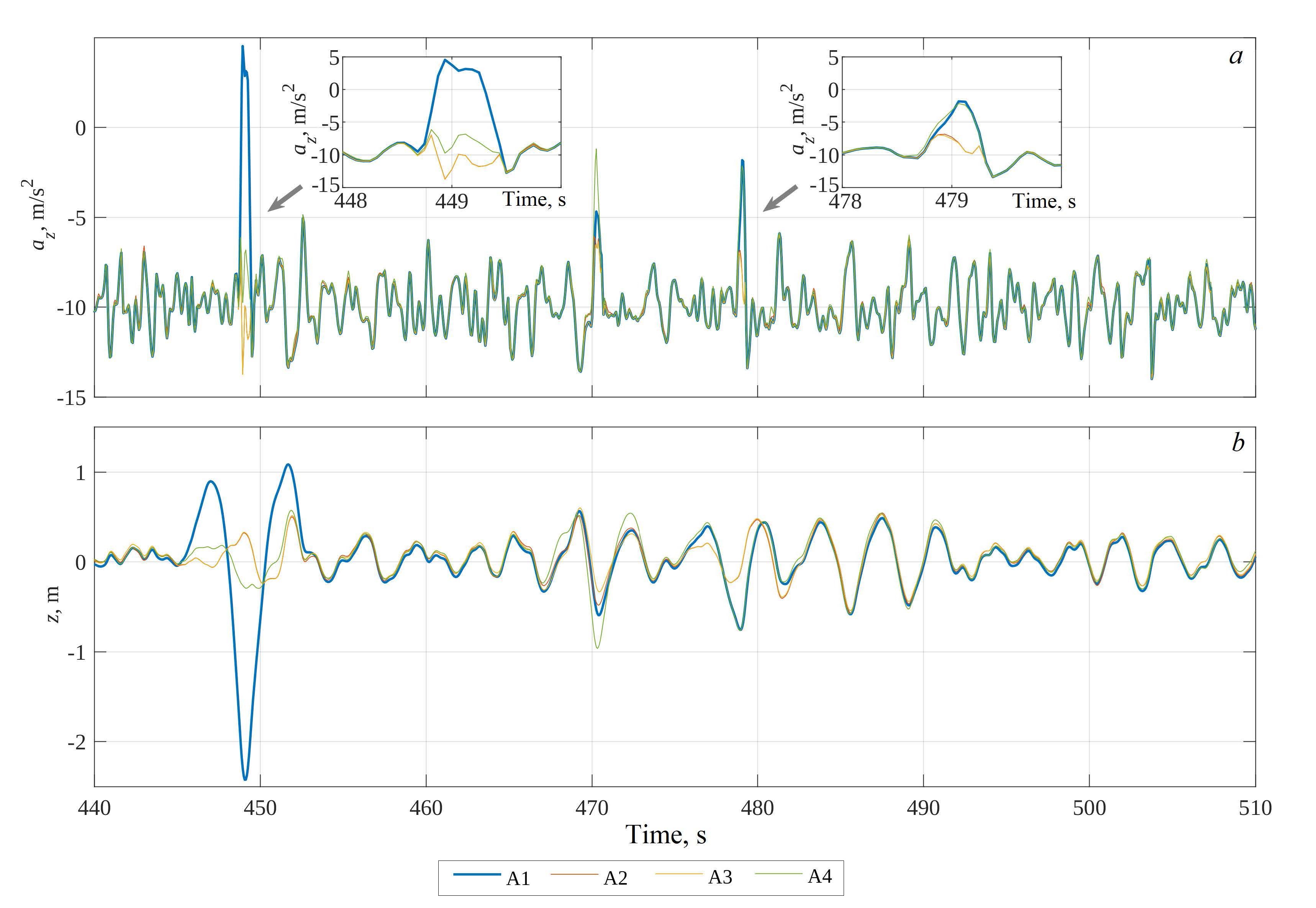 The sea surface elevations obtained by integrating the accelerations are shown in Fig. 3, b. The low-frequency components of the accelerations introduce unacceptable errors into this signal, so for this Figure the original series are high-pass filtered with a time constant equal to the period of the peak waves, 5 s. During the event at 449 s, the height difference according to algorithm A1 is unrealistically large, more than 3 m, while the SWH is about 0.7 m. The reason is obviously the penetration of horizontal accelerations into the vertical acceleration signal due to the fact that the hull orientation is not taken into account by the A1 algorithm. The corrections introduced by the A2–A4 algorithms allow the smoothing of such spikes, as can be seen in Fig. 3, b.