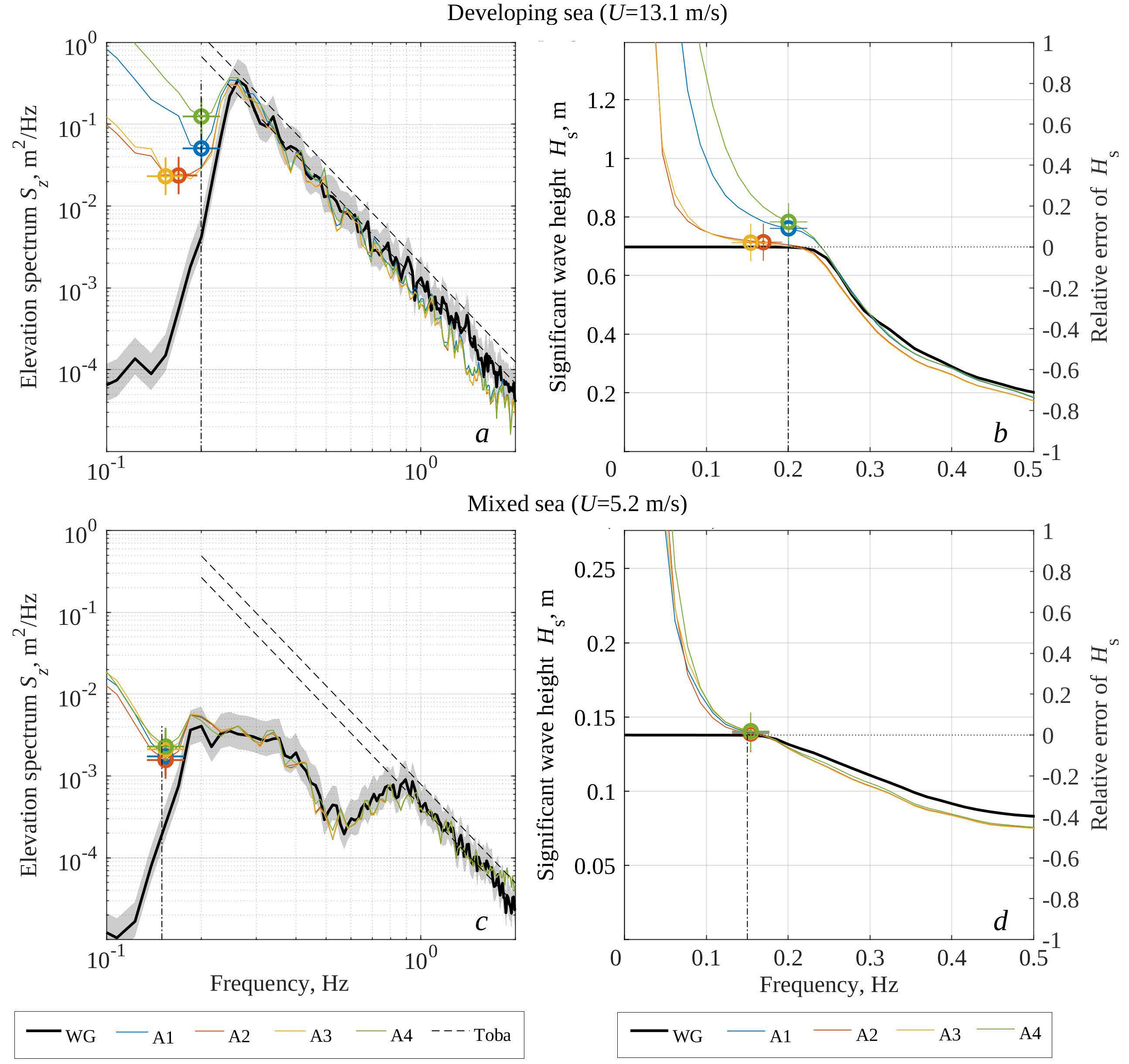Figure 4 a, c shows the elevation spectra calculated from 30-min records under developing and mixed sea conditions, with the initial time series divided into successive 1-min intervals and further averaging over them. These estimates are based on vertical accelerations obtained using the A1–A4 algorithms (colored lines). The elevation spectra measured by the wave gauge (black lines) are given as a reference. In the operating frequency range (0.2–1 Hz), all spectral estimates agree within the confidence intervals, as well as with the empirical level of the Toba spectrum [40], regardless of the choice of the processing algorithm. At frequencies above 1 Hz, the possible deviations are related to the transfer function of the buoy hull and to Doppler distortions of the reference wave gauge spectra [41].