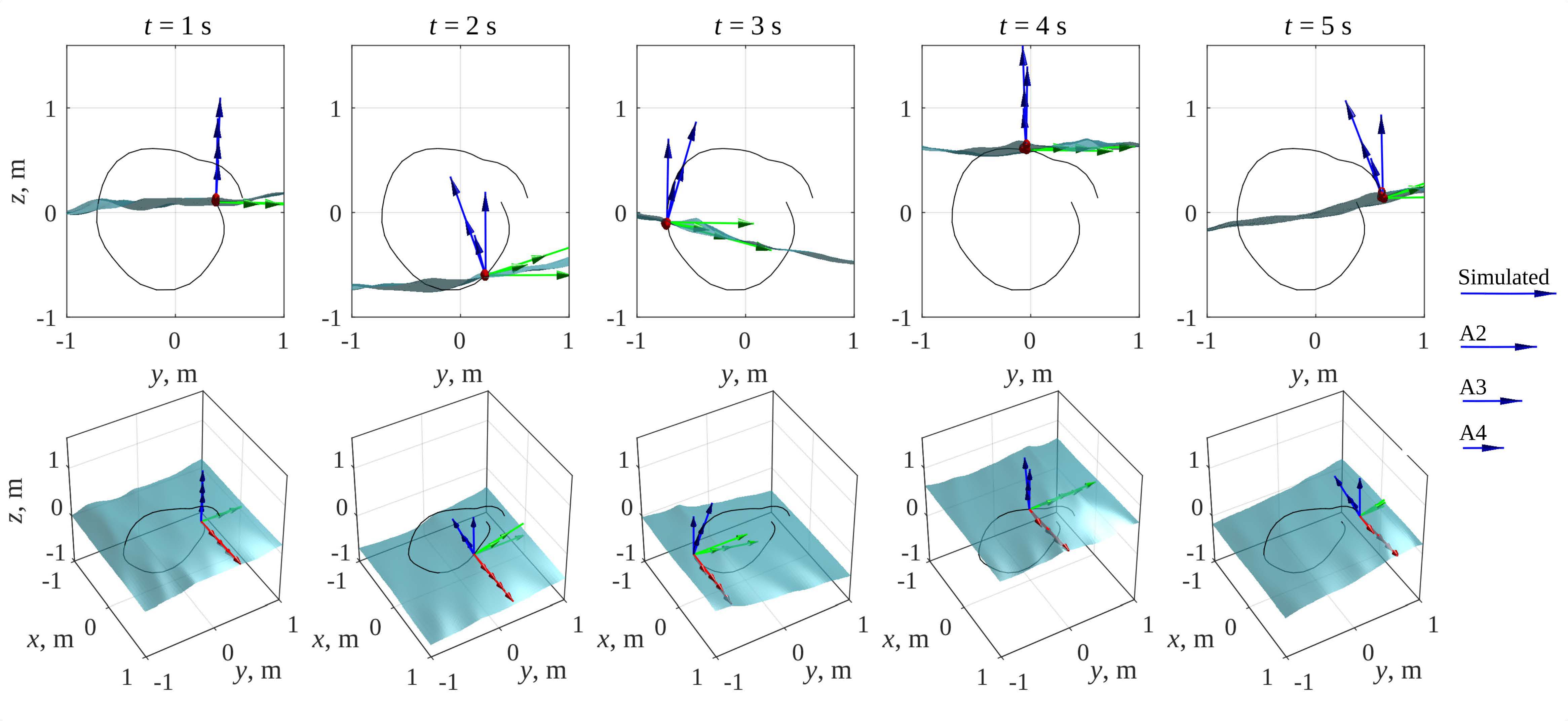 Fig. 5. An example showing a numerical simulation of the sea surface during a peak wave period for five equally spaced instants: side view – on the top, general view – on the bottom. The colored arrows show the orientations of the virtual buoy estimated by algorithms A2–A4, the black line is the trajectory of the buoy